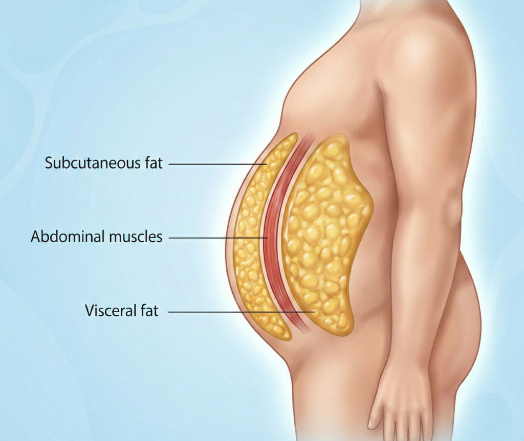 Visceral fat is found inside your abdominal cavity, surrounding your liver, pancreas, and intestines. You can’t see or feel it from the outside. What makes it especially concerning is that it acts more like an active organ, constantly releasing fatty acids, inflammatory proteins, and hormones into your bloodstream.